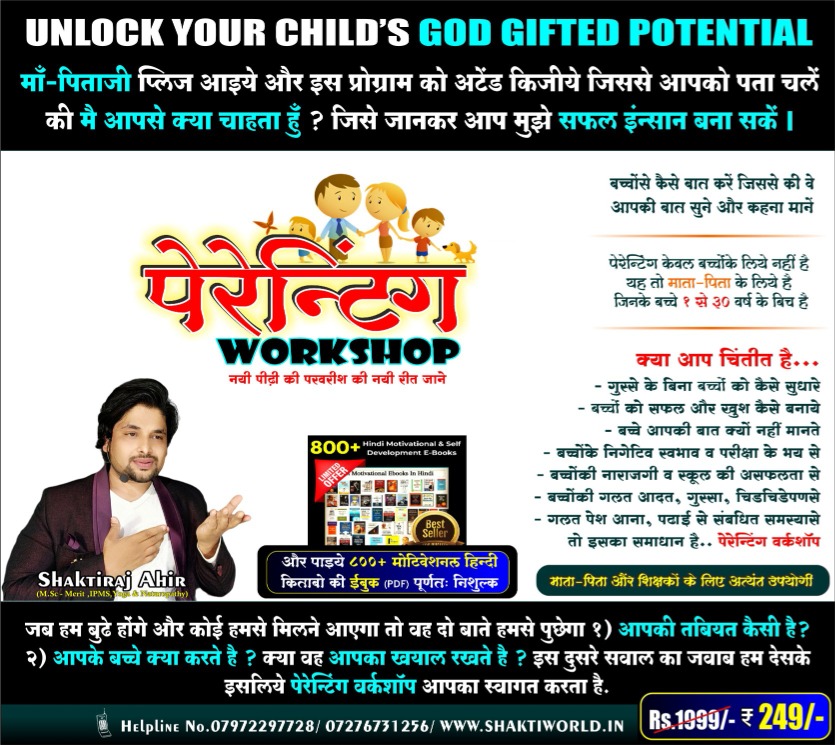 ⚡ UNLOCK YOUR CHILD'S GOD GIFTED POTENTIAL ⚡ 🔥 Hello Parents, क्या आप चिंतित है, की 👶🏻 बच्चे के गुस्से, चिडचिडेपण, ज़िद्दी स्वभाव को कैसे कम करे ? 👩🎓 बच्चोंकी नाराजगी व स्कूल की असफलता को कैसे कम करे ? 📲 बच्चे के TV-Mobile-Games की आदत को कैसे कम करें ? 📚 बच्चे का STUDY में Focus & Concentration को कैसे बहेतर बनाये ? 🧏♂️ क्या आप बच्चो को Respectful & Responsible बनाना चाहते है? 🧏♂️बच्चोंका गलत पेश आना, पढ़ाई से संबंधित समस्यासे, तो इसका समाधान है.. पेरेन्टिंग वर्कशॉप